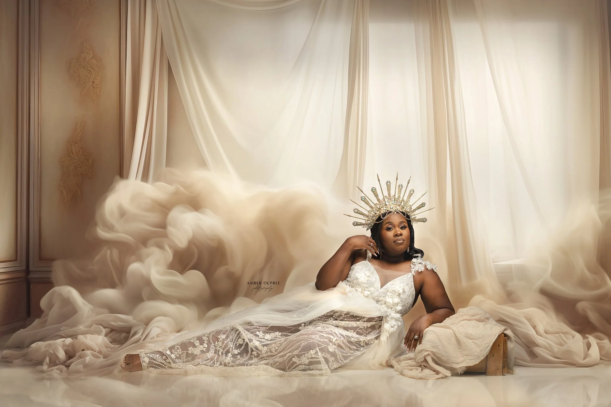 Consider style, experience, location, reviews, and offerings. You want someone whose style matches your vision and has experience with photographing pregnant women. Other things to think about when booking a maternity photographer, do they offer a client closet or do you have to purchase and bring your own? Here at Amber Dupree Photography, an extensive client closet is available with accessories, headpieces, body jewlery and more!